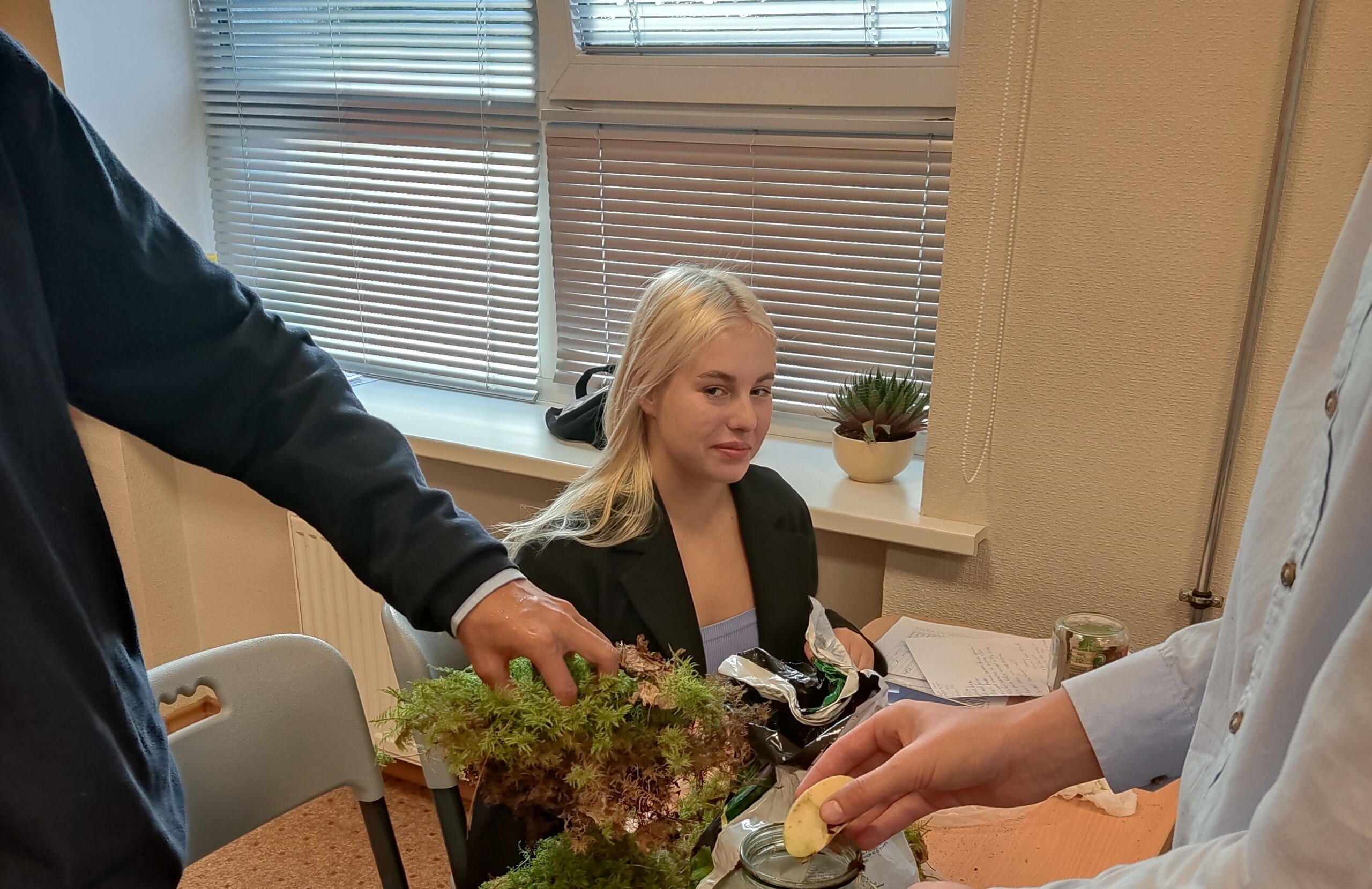 Bioloģijas stundās 9. klases skolēni, izmantojot instrukciju, grupā modelēja, savu izplānoto ekosistēmu burkā