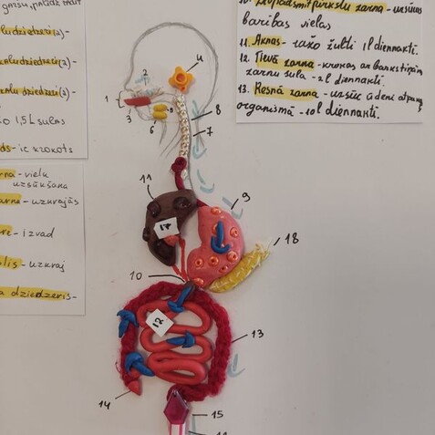 Bioloģijas stundās 8. klases skolēni, izmantojot dažādus informācijas avotus, grupā veidoja cilvēka gremošanas orgānu sistēmas modeli.