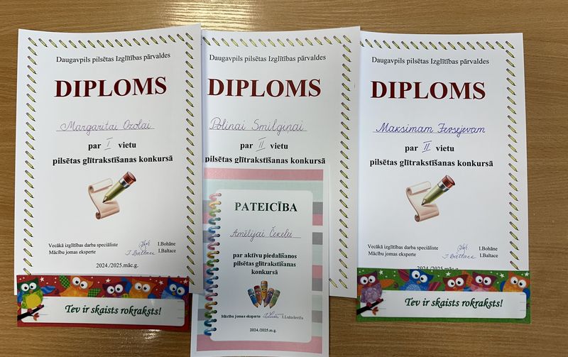 Sveicam licejistus, kuri pilsētas glītrakstīšanas konkursā 1.-2.kl skolēniem ieguva godalgotas vietas: