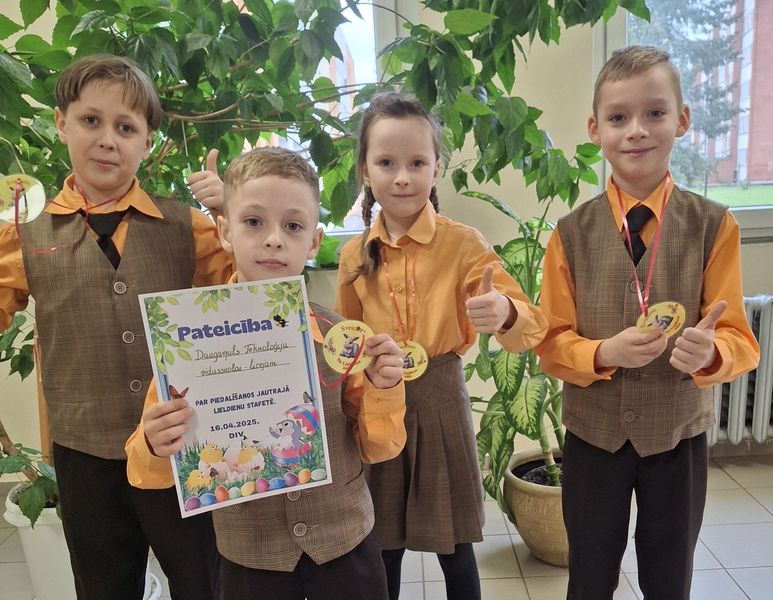 Tehnoloģiju vidusskolas-liceja 1.plūsmas 4 skolēni Martins Serovs, Zahars Aleksejevs, Lolita Puzinkeviča un Jevsejevs Maksims 16.aprīlī piedalījās Daugavpils pilsētas pasākumā “Lieldienas”, kuru organizēja Daugavpils Iespēju vidusskola. Pasākuma mērķis bija rosināt skolēnu interesi par Latvijas svētkiem un Lieldienu tradīcijām. Visi pasākuma dalībnieki tika sadalīti krāsu komandās un piedalījās dažādās aktivitātēs. Uzvarētāji bija visi, bērni saņēma saldumiņu un medaļas. Mūsu 4 “Lieldienu zaķi”- pirmklasnieki bija ļoti apmierināti un priecīgi!