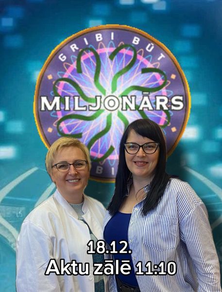 18. decembrī plkst. 11.10 Skolas parlaments aicina visus uz aizraujošu spēli "Kas grib kļūt miljonārs?", kurā piedalīsies mūsu skolas ķīmijas skolotāja I. Halatina un bioloģijas skolotāja I. Kostenko. Dalībniekiem būs jāatbild uz dažādiem āķīgiem un interesantiem jautājumiem, pārbaudot savas zināšanas un loģisko domāšanu. Vai viņi spēs tikt līdz "miljona" jautājumam?