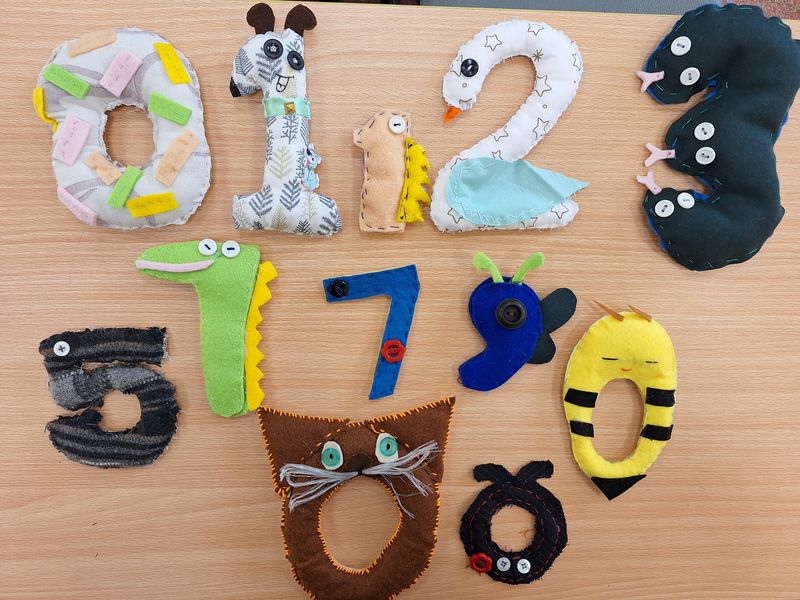 Dizaina un tehnoloģiju stundās 8.klases skolēni ar rokām šuva jautrus ciparus. Cipariņi tik uzdāvināti matemātikas sākumskolas skolotājiem.