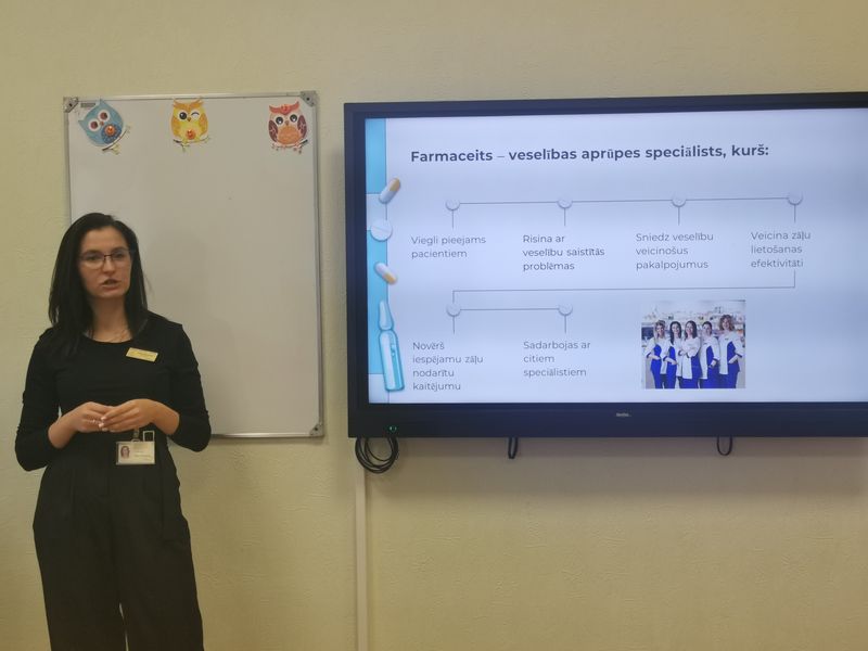 Par to, kāda ir ikdiena farmaceita darbā, kādas ir iespējas, strādājot šajā profesijā un ko darīt, ja vēlies kļūt par farmaceitu, 9.,10. klašu skolēniem stāsta Mēness Aptiekas farmaceite Ērika Pētersone. Jaunieši uzzināja, ka farmaceita profesija ir daudzveidīga, un tajā vienmēr ir iespēja attīstīties un apgūt ko jaunu. Vienlaikus tā ir viena no profesijām, kas sniedz lielu gandarījumu un tūlītēju atgriezenisko saiti. Erika Pētersone sacīja, ka pēc farmaceita diploma iegūšanas ir iespējams turpināt studijas doktorantūrā vai maģistrantūrā klīniskās farmācijas, rūpnieciskās farmācijas, biomedicīnas un citās programmās.