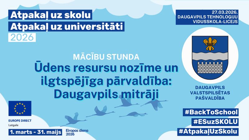 27. martā Daugavpils Tehnoloģiju vidusskolā – licejā Vides dienu Latgalē 2026 ietvaros 10.a klasē notika mācību stunda "Ūdens resursu nozīme un ilgtspējīga pārvaldība: Daugavpils mitrāji". Nodarbību vadīja Daugavpils pašvaldības centrālās pārvaldes Attīstības departamenta Investīciju un starptautisko sakaru nodaļas starptautisko projektu vadītāja Jolanta Ūzuliņa.